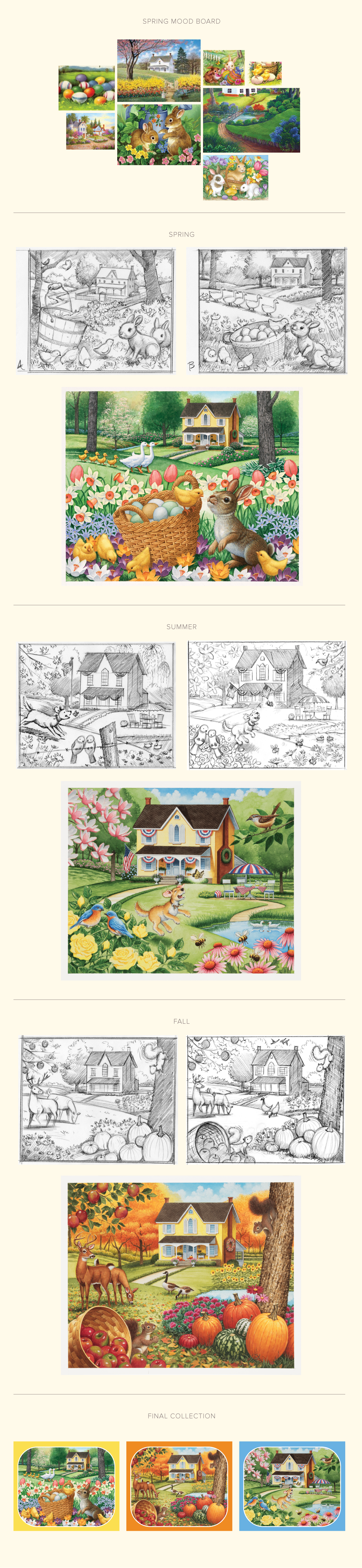 Cheryl’s Cookies has a close relationship with QVC and regularly creates exclusive products to sell on their platforms. We wanted to do something really special and unique beginning with an Easter/spring box. I collaborated with the lead merchant and creative director to develop the concept of a classical home in the country that we see changing each season. I provided art direction to the Illustrator, Richard Cowdrey. The art direction included illustration style, elements that we wanted included in each scene and feedback from the team. After two rounds of sketches per illustration, he delivered the final illustrations and I created the final package designs. This collection was extremely successful. One of the boxes even sold 40k units in a single day. We continued to work with Richard on a number of other successful collaborations for QVC as well.