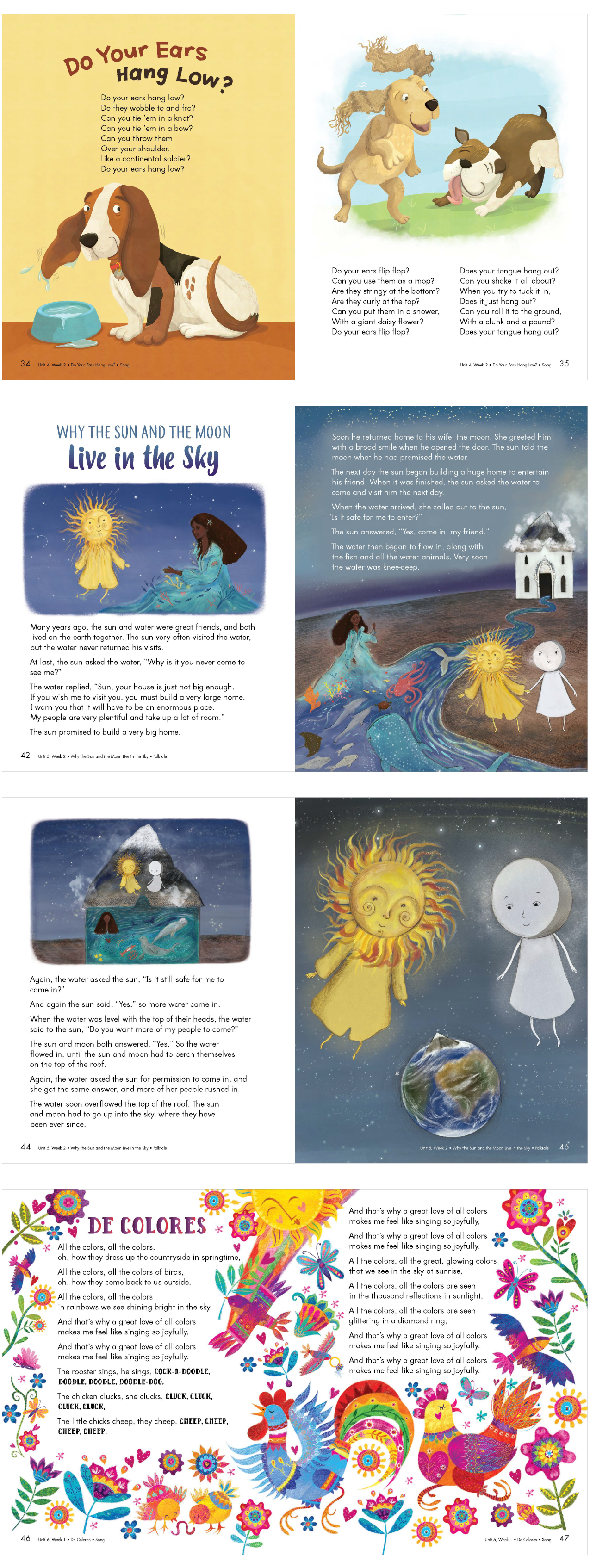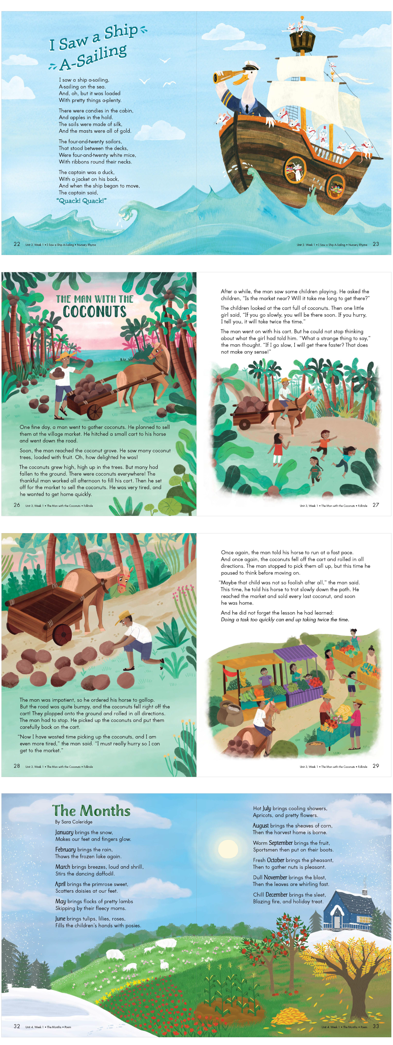 The “Big Book” at Zaner-Bloser is a collection of stories, poems and songs that Kindergarten teachers read to their students during circle time. The team decided that each section would have it’s own illustrator. This would create a unique look and feel for each of the 16 sections. I was the lead designer for this book, so I designed all of the page layouts, title designs and the book cover design. I also provided art direction for the illustrations for internal and external illustrators, as well as illustrating one of the poems myself. The poem I illustrated is called “The Months.” It is about the different seasons throughout the year. My concept was to show one scene that depicted all four seasons being described in the poem. Here you will see the process I used to create the illustration from sketch to final art, as well as a sampling of spreads from inside the book.